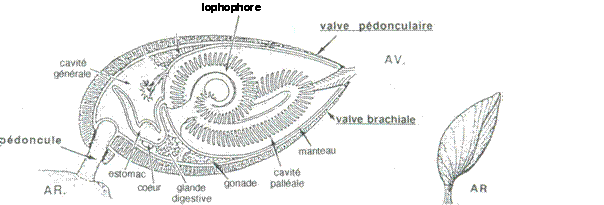 Sur les formes actuelles, vivantes, on observe un organe particulier et caractéristique : le lophophore, constitué par deux bras spiralés ciliés, qui produit, à l’intérieur de la coquille, un courant d’eau dont le rôle est à la fois nutritif et respiratoire. Le lophophore est soutenu par un appareil squelettique calcaire, et donc fossilisable : le brachidium, lequel a donné son nom à l’embranchement.
