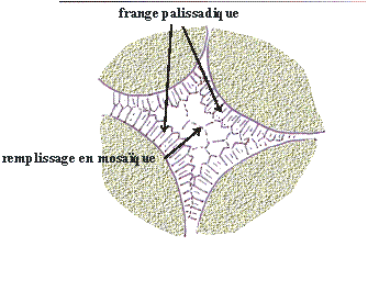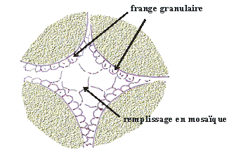 ** Il arrive que l’on puisse distinguer une organisation peu marquée en frange le long des parois. Il s’agit d’une calcite dite « drusique », provenant, au départ d’une frange de calcite granulaire qui évolue, en cours de croissance, vers une calcite en mosaïque.