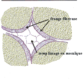 Les cristaux précipités en ciment s’organisent selon une certaine architecture. On distingue deux types d’organisation : les cristaux en frange et les cristaux en mosaïque.
