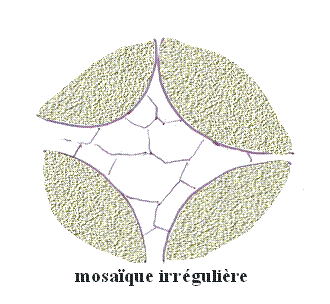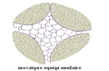 β) en mosaïque irrégulière constituée de cristaux de dimension inégale qui tendent à remplir tout l’espace par accroissement de taille.