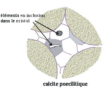 γ) La calcite poecilitique : où certains cristaux sont suffisamment importants pour englober un ou plusieurs éléments figurés (bioclastes, pellets, oolithes etc..). On distingue alors une plage cristalline contenant, en inclusion, un ou plusieurs éléments figurés, ne présentant pas de synchronisme d’extinction en LPA. Ces éléments en inclusion dans le cristal sont « étrangers » au réseau cristallin.