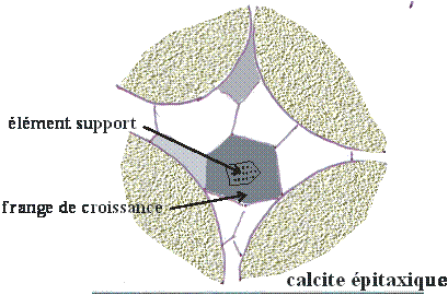 δ) La calcite épitaxique : où le cristal de calcite croît à partir d’un élément support (le plus souvent un débris d’Échinoderme), en continuité avec le réseau cristallin de cet élément. Cet accroissement se marque par une frange de croissance limpide autour de l’élément d’origine. Ce dernier et la frange de croissance constituent un seul et même cristal de calcite : en LPA il y a synchronisme d’extinction de l’ensemble***.