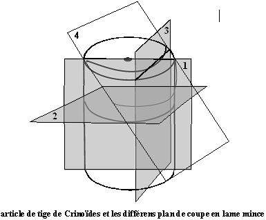 Les plaques et les articles des tiges sont monocristallins, c'est-à-dire constitués d’un seul cristal de calcite. C’est l’un des caractères essentiel de la reconnaissance des restes de Crinoïdes. Par ailleurs les plaques des bras sont percées d’un canal souvent excentré. Les articles des tiges ont des formes très variables en section, rondes, ovales, pentagonales, en étoile à 5 branches (à noter que l’on reconnaît souvent la symétrie pentaradiée des Échinodermes). Très souvent on reconnaît sur les sections en lame mince un canal central (attention sur les sections tangentielle la section ne recoupe pas le canal).