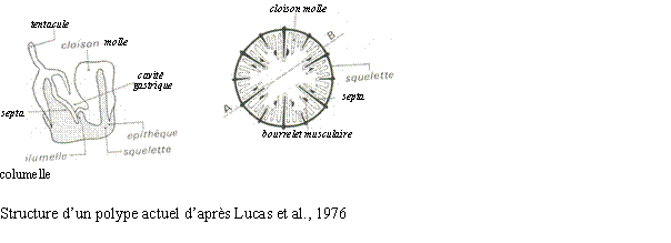 Le polypier ou calice revêt des formes très diverses. Il abrite la partie vivante (molle) ou polype dont l’ectoderme sécrète le squelette calcitique. Le développement du polypier débute par une lame basale qui donnera le plancher et sur laquelle s’édifie la paroi et les cloisons radiales, ou septa [Planche_55]. Au fur et à mesure de la croissance il s’édifie une succession de planchers qui surélève le fond du calice. Le centre du calice est parfois occupé par une columelle.