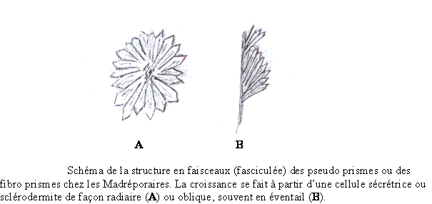 Fibres ordonnées en faisceaux [Planche_56, Planche_57] de disposition soit radiaire, soit perpendiculaire ou oblique à l’axe de la paroi. Chaque faisceau à pour origine une cellule sécrétrice ou « sclérodermite ».