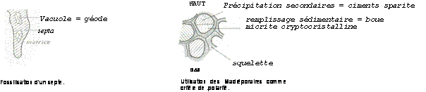 Si la recristallisation du squelette est très poussée, celle-ci peut oblitérer la micro structure fibreuse. Par ailleurs, les vides d’origine diverses et notamment ceux liés à l’organisation du calice peuvent être, soit remplis de sédiment (en général de la boue micritique), soit comblés par de la sparite limpide de précipitation secondaire. Dans ce dernier cas, la structure du squelette n’apparaît plus, sinon sous forme d’un « fantôme ».
