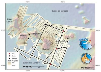 Une superficie de 80000 km2 a été explorée autour des iles volcaniques de l’Archipel des Comores, dont Mayotte. Les nouvelles données géophysiques et géologiques acquises permettent d’identifier les structures récentes et actives (volcans sous-marins, failles, glissements), renseignent sur leur mise en place et âge, sur le rôle de l’héritage et sur l’architecture et nature du substratum sur lequel ce sont mis en place les iles.