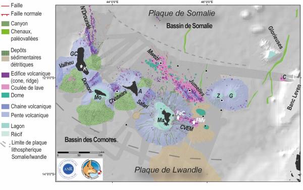 Pour en savoir plus, voir référence article : Thinon I., A. Lemoine, S. Leroy, F. Paquet, C. Berthod, S. Zaragosi, V. Famin, N. Feuillet, P. Boymond, C. Masquelet, N. Mercury, A. Rusquet, C. Scalabrin, J. Van der Woerd, J. Bernard, J. Bignon, V. Clouard, C. Doubre, E. Jacques, S. J. Jorry, F. Rolandone, N. Chamot-Rooke, M. Delescluse, D. Franke, L. Watremez, P. Bachèlery, L. Michon, D. Sauter, S. Bujan, A. Canva, E. Dassie, V. Roche, S. Ali, A. H. Sitti Allaouia, C. Deplus, S. Rad et L. Sadeski-2022- Volcanism and tectonics unveiled in the Comoros Archipelago between Africa and Madagascar / Volcanisme et tectonique découverts le long de l’archipel des Comores entre l’Afrique et Madagascar . Comptes Rendus Géoscience—Sciences de la Planète 0000, 1, no 0, p. 000-000 https://doi.org/10.5802/crgeos.159