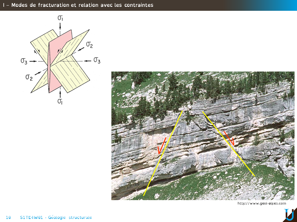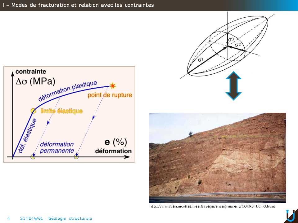 La rupture du matériau peut intervenir au-delà de la limite élastique et au-delà du comportement plastique. Nous allons étudier ici les aspects macroscopiques de la fracturation. L'objectif est toujours de faire la relation entre les déformations (ici de la fracturation) et les directions principales de l’ellipsoïde des contraintes.