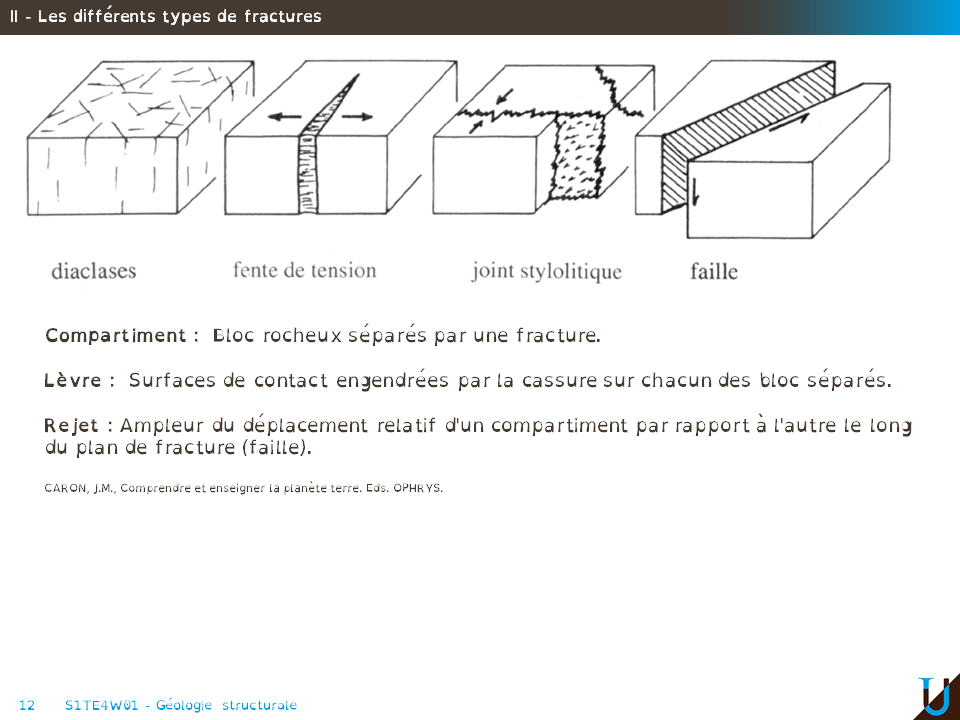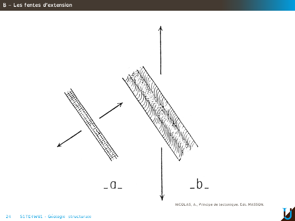 Les fentes d’extension se distinguent des joints et diaclases par un remplissage témoignant d’une certaine ouverture. Le déplacement responsable de l’ouverture s’effectue perpendiculairement à la fracture.