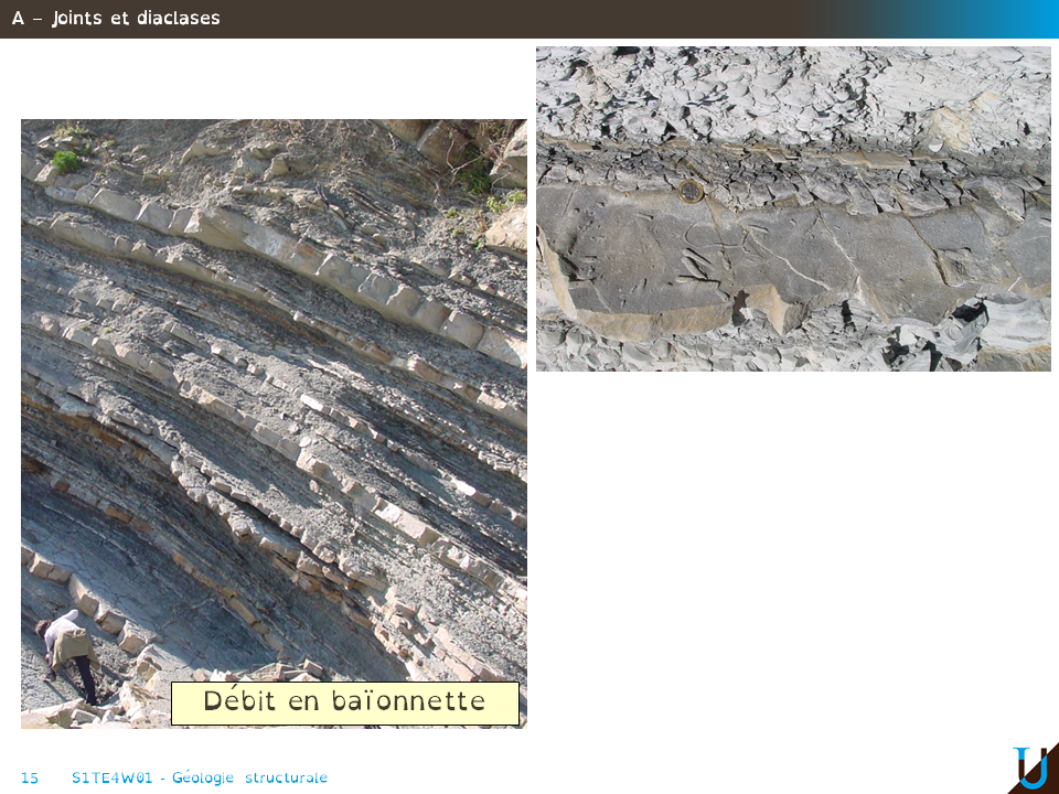 Exemple ici de diaclases dans les flysch du Pays basque. Les diaclases entraînent un débit typique des bancs en dents de scie : c'est le débit en baïonnette.