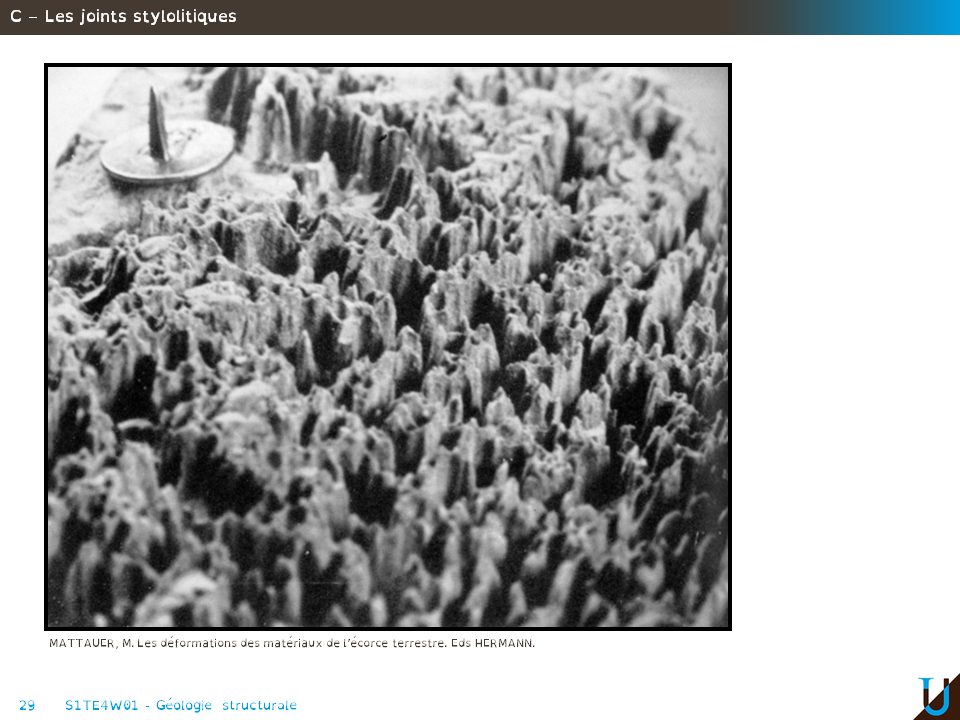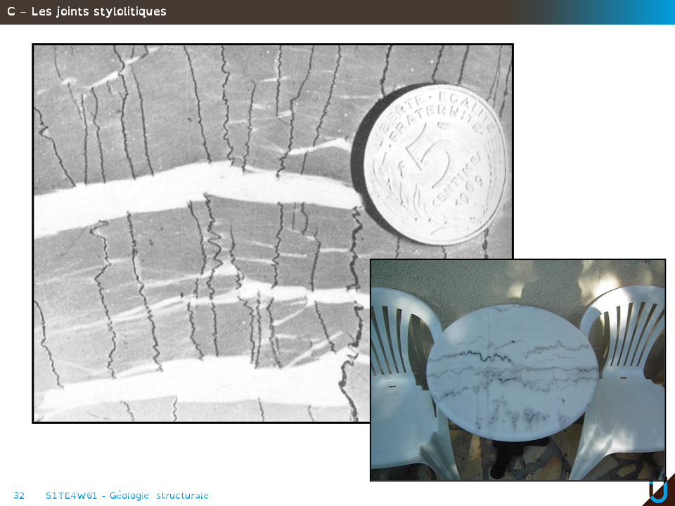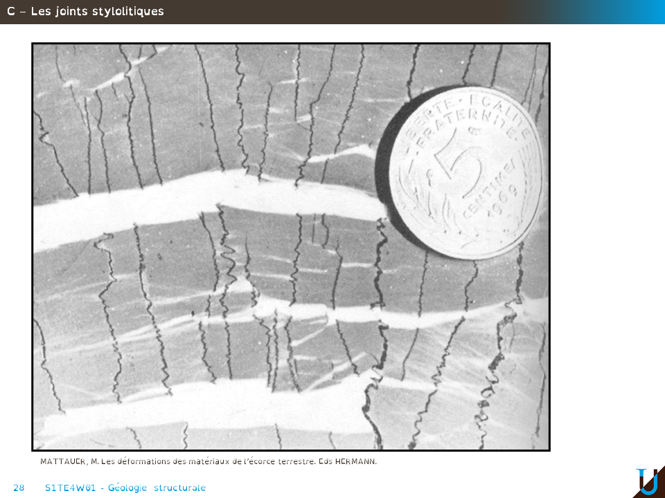 Nous allons nous intéresser un peu plus en détail à cette photo. Ici les joints stylolitiques sont associés à des fentes remplies de calcite, il s'agit de fentes d'extension.