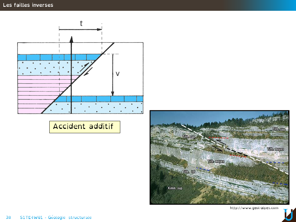 Les failles inverses résultent d’une compression. Il s’agit d’accidents additifs. Cette fois si l'on fait un forage, des terrains vont être traversés deux fois, ici les terrains en bleus : on parle de duplex.