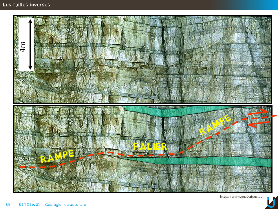 Les failles inverses vont traverser les couches compétentes (calcaires, grès) avec un pendage important on parle de rampe.