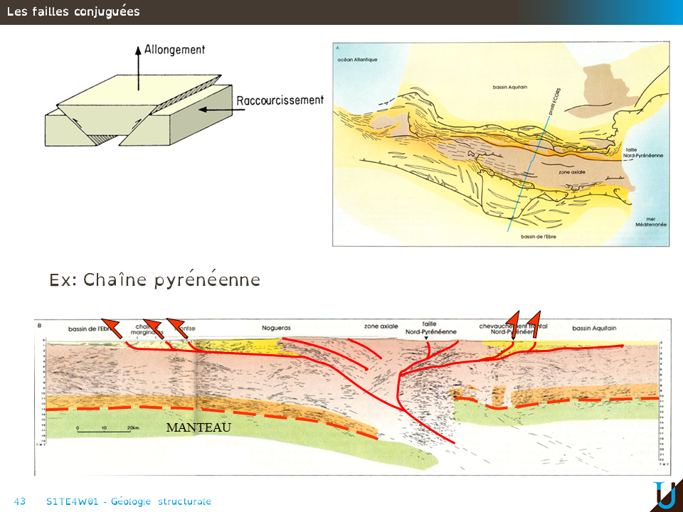 Pour ce qui est des systèmes de failles conjuguées en compression, l'exemple le plus courant est la chaîne de montagne. Un exemple type est la chaîne de Pyrénées avec une forme symétrique en éventail du réseau de failles inverses et de chevauchements. Il s’agit ici d’un profil sismique ECORS qui traverse toute la chaîne. La morphologie des failles a permis de mettre en évidence le poinçonnement de la plaque iberique, au sud par la plaque européenne.