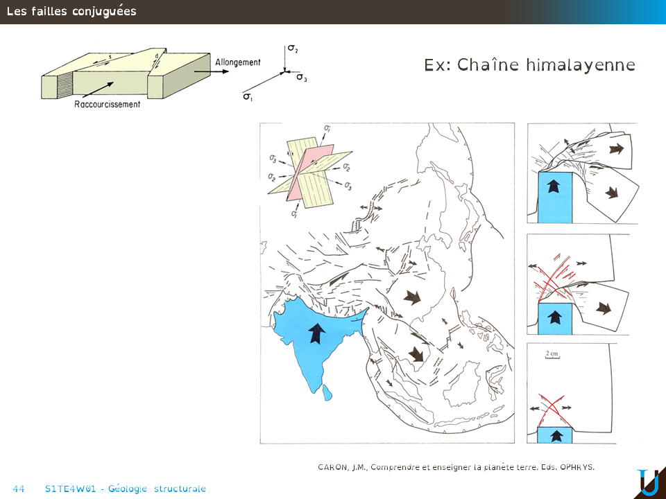 Cette collision a entraînée de grands chevauchements vers le Sud et un raccourcissement de la plaque Nord Indienne d’environs 1000 km. Un raccourcissement du même ordre est enregistré par la plaque asiatique. L’Inde pénètre donc la plaque asiatique à la manière d’un poinçon. De grands décochements affectent la zone. Ce sont des failles conjuguées. Il s'agit des familles dextres et senestres obliques à σ1 du schéma contraintes vs fracturation.