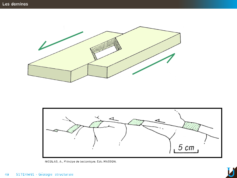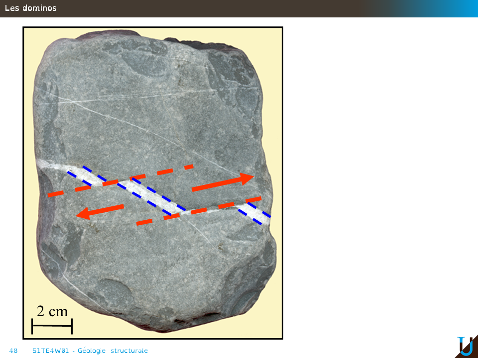 Dans les secteurs en extension peuvent se retrouver des dominos ou de fibres allongées parallèlement à la surface de la faille.