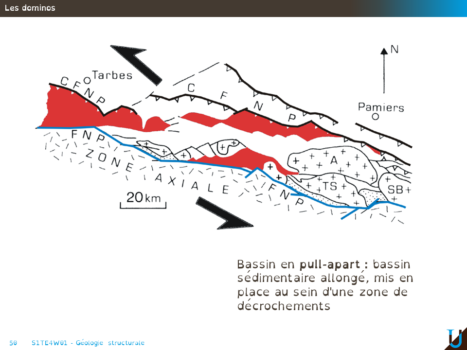 A une autre échelle voici des dominos crées par un décrochement senestre le long de la faille Nord pyrénéenne. Cette fois on change complètement d’échelle, mais vous voyez que les structures restent les mêmes. A l’intérieure des espaces vides crées par le jeu de la faille il a formation de bassins sédimentaires de type pull-apart.
