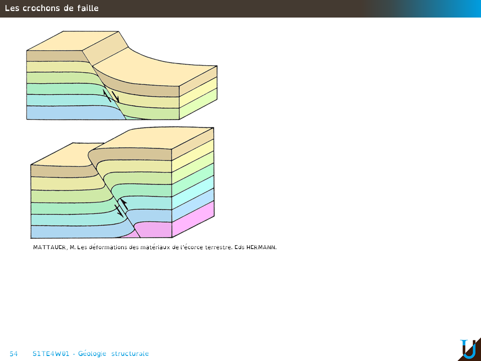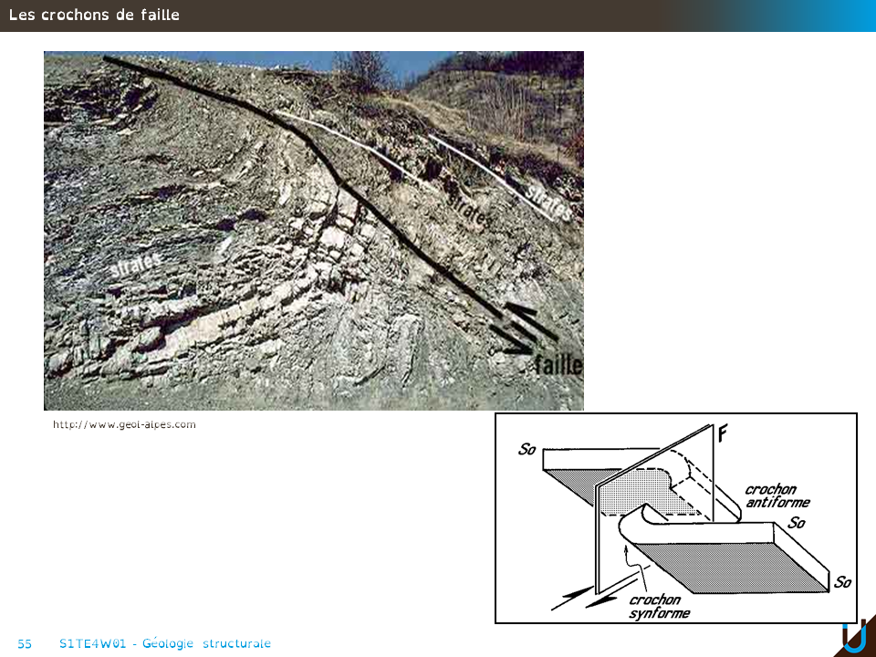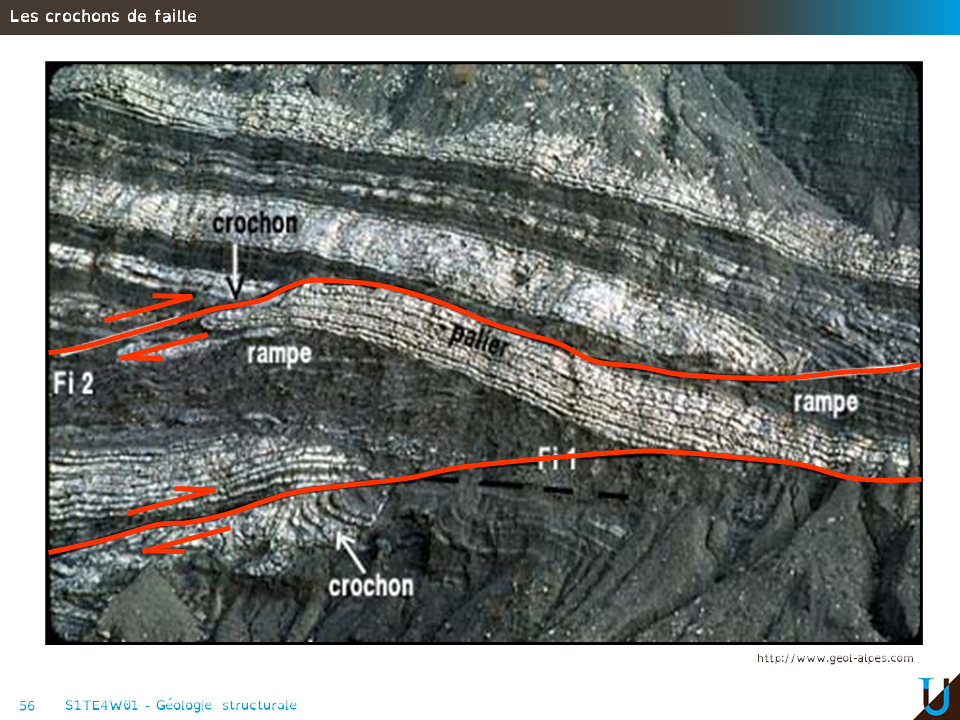 On constate souvent que les couches sont rebroussées au voisinage des failles. On parle de crochon de faille. La forme des crochons va nous donner directement des informations sur le jeu de la faille. En fait le rebroussement de la couche est en sens inverse du mouvement.