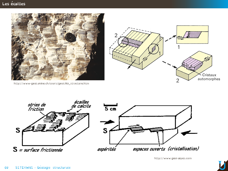 Il s’agit d’une combinaison entre des stries et de la cristallisation, ici de la calcite. Dans ce cas le plan de faille est enduit de produits de recristallisation. Ces recristallisations ont généralement un aspect fibreux. qui indique la direction du mouvement. Le meilleur critère pour déterminer le sens du déplacement consiste dans l’observation des reliefs qui limitent les enduits de calcite fibreuse. La terminaison abrupte des recristallisations permettent de retrouver le sens du mouvement.