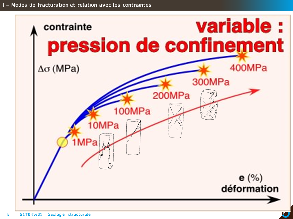 Ces divers comportements peuvent s’expliquer avec la courbe contrainte / déformation. Si la pression de confinement augmente, le domaine ductile augmente. La rupture se produit donc pour des contraintes plus importantes. Les fractures seront plus réduites mais en nombre bien plus important.