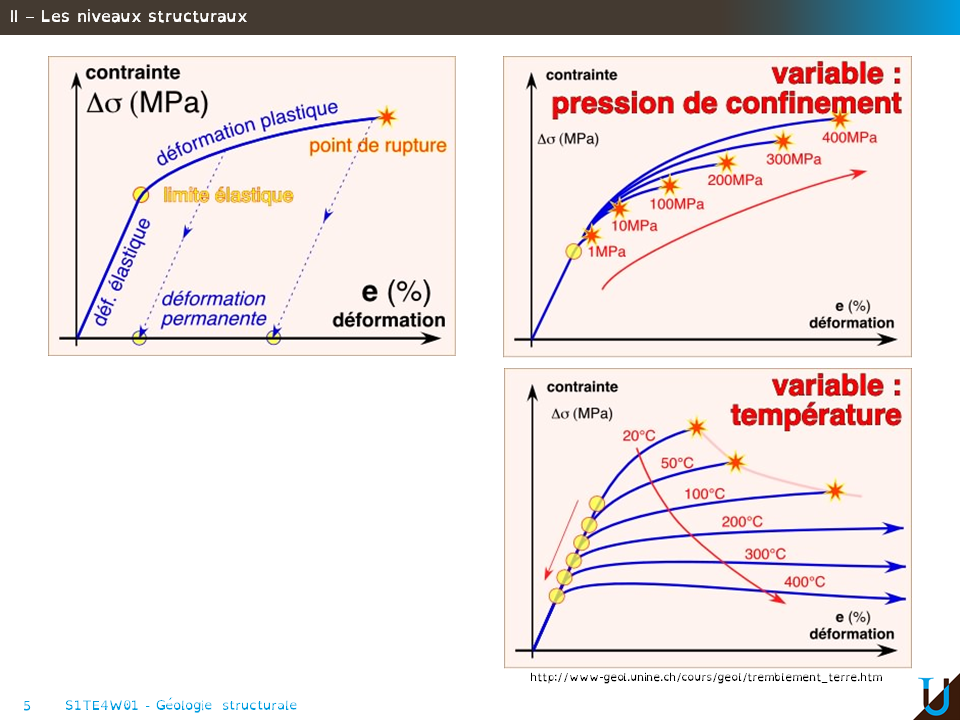 Nous avons déjà vu ensemble que le comportement des roches dépendait essentiellement de la température et de la pression de confinement. Si la température augmente, le domaine cassant s'éloigne et le domaine ductile augmente. Si la pression de confinement augmente, c'est la même chose, le domaine ductile s'allonge et le point de rupture s'éloigne. Si la température augmente significativement on passe dans le domaine du fluage, les roches se comportent alors comme un liquide très visqueux.