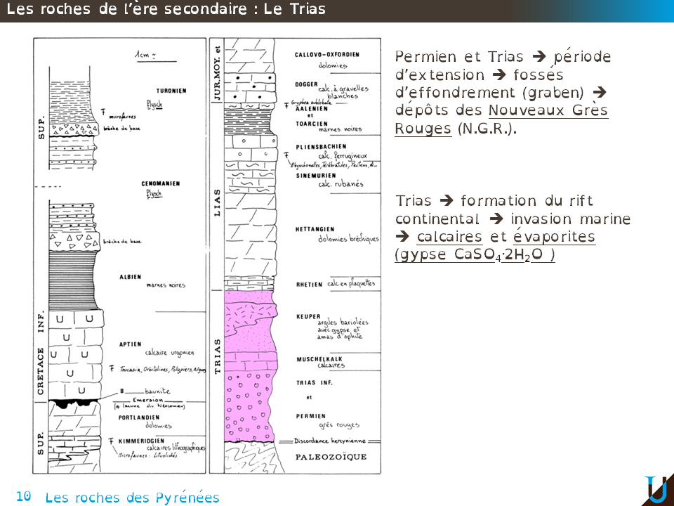 Vous pourrez suivre l'ordre chronologique sur le log synthétique de votre fascicule. Nous allons donc commencer à la base du log par les roches du Trias. Les formations triasiques arrivent en discordance sur les terrains paléozoïques.