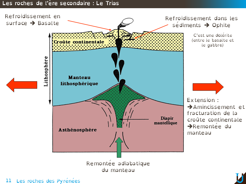 Les profondes fractures qui affectent ce rift continental, structure distensive, entraînent la remontée de roches magmatiques : les ophites issues du manteau. Cette phase d'extension a donc permis une remontée adiabatique c’est-à-dire sans échange thermique du manteau. Cet amincissement de la lithosphère aboutit ainsi à la remontée d'un magma basaltique. Lorsque ce magma atteint la surface on obtient du basalte, mais si le magma reste dans la croûte continentale, dans des formations sédimentaires, il se forme alors des dolérites. Les ophites sont des dolérites typiques de la région des Pyrénées.