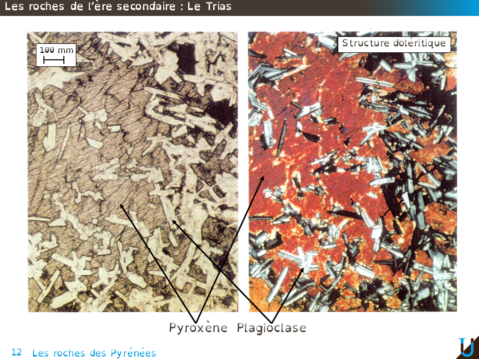 Voici des photos d'un échantillon d'ophite prise au microscope, en lumière naturelle et en lumière polarisée. Les ophites sont constituées essentiellement de plagioclases (petites tablettes blanches) enserrant ou incluses dans de grands cristaux de pyroxène. On parle de structure doléritique.