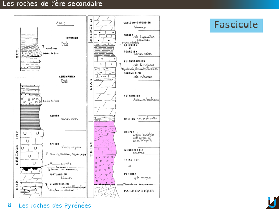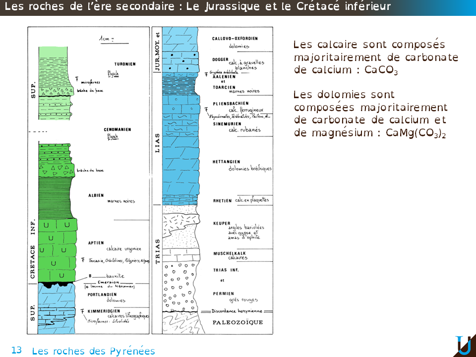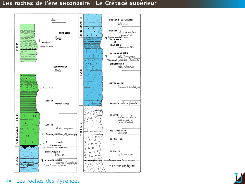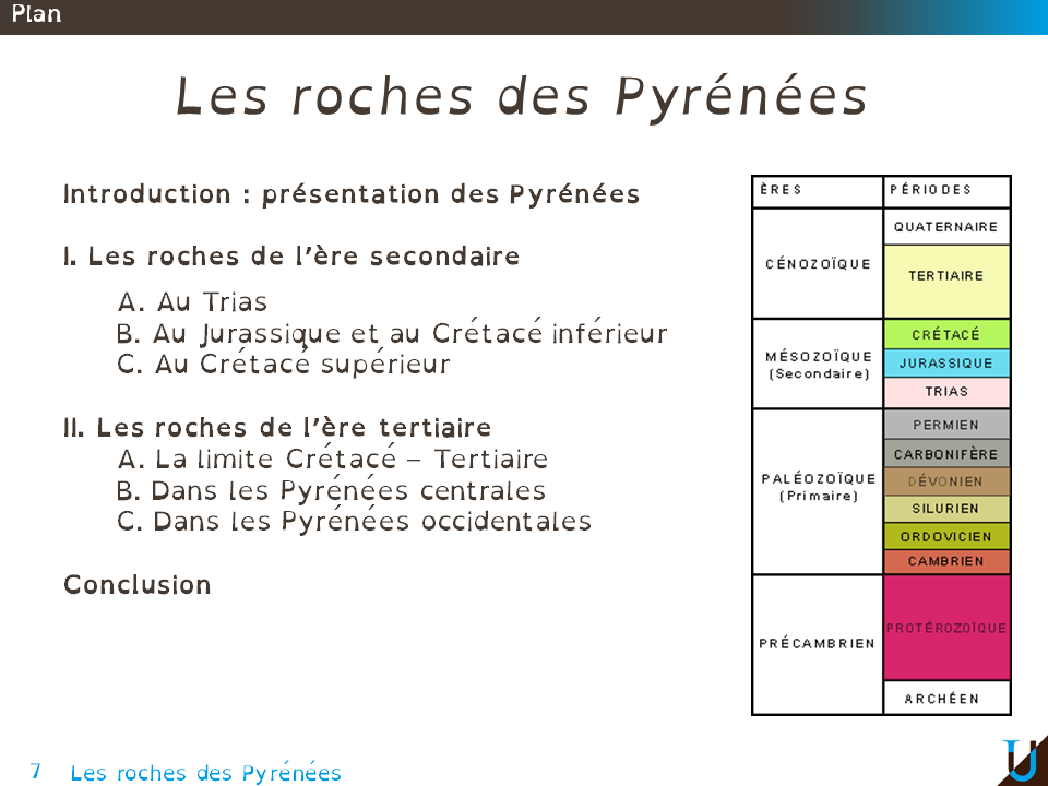 Cette séance fait partie des 2 séances dédiées aux Pyrénées. Tout au long de ce cours nous allons passer de l’observation de terrain, par le biais de l’étude des roches et des cartes géologiques, jusqu'à la synthèse expliquant la formation des Pyrénées. Les roches vont vous être présentées dans un ordre chronologique, et ce à partir de l’Ère secondaire. Avec tout d’abord, les roches du Trias puis du Jurassique et Crétacé. Dans une deuxième partie les roches de l’Ère tertiaire, avec le passage de la limite KT, puis les roches des Pyrénées centrales et des Pyrénées occidentales.