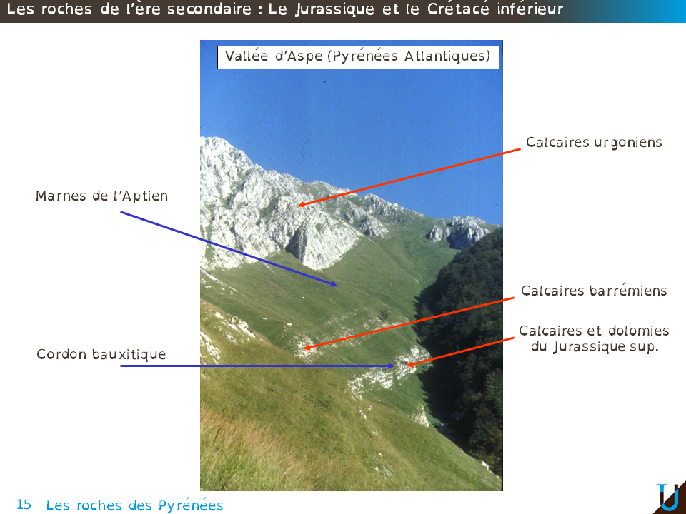 Non visible sur la photo mais observable à l'affleurement on peut noter la présence de bauxite au sommet du Jurassique. La bauxite est une roche résiduelle témoignant de l'érosion de calcaires dans un environnement continental. Ce cordon de bauxite traduit donc une période d'émersion à la fin du Jurassique. La mer revient au Barrémien avec la mise en place de calcaires barrémiens et de marnes aptiennes. Le sommet est constitué de calcaires caractéristiques : les calcaires urgoniens.