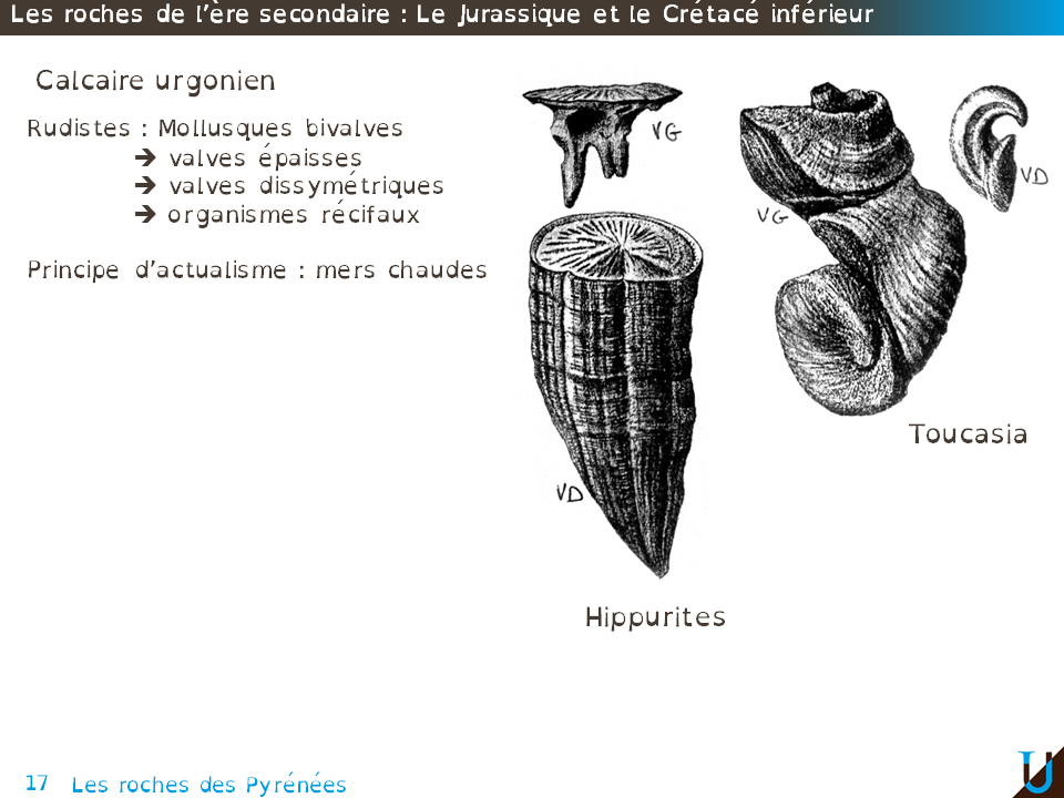 Voici pour exemple, deux représentations de fossiles de rudistes. Il s'agit de mollusques bivalves présentant des valves épaisses et dissymétriques. Ces organismes vivaient fixés sur le fond en association avec des polypiers. Selon le principe d'actualisme on admet un mode de vie récifal dans des mers chaudes.