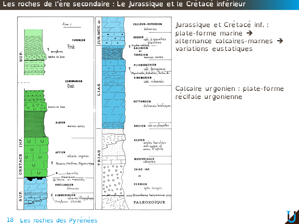 Au cours du Jurassique et du Crétacé inférieur nous avons donc ici les témoins d’une sédimentation sur une plateforme. L’alternance calcaires & marnes témoigne de variations du niveau marin, on parle d’eustatisme. A la fin du Jurassique la présence de bauxite témoigne de périodes d’émersion. La mer revient au Crétacé, on parle alors de la transgression du Crétacé. Au Crétacé, le calcaire urgonien à rudiste témoigne du développement de zones récifales : la plateforme urgonienne.