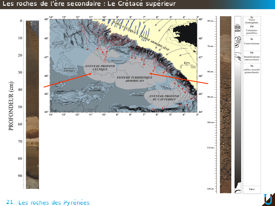 Nous pouvons faire une analogie entre ces flyschs et les dépôts turbiditiques qui se déposent actuellement dans le domaine marin profond du golfe de Gascogne. Voici pour exemple des dépôts turbiditiques prélevés dans le domaine profond du golfe de Gascogne, à plus de 4500 m de profondeur. Ces carottes sédimentaires présentent une alternance de niveaux sableux décimétriques à métriques intercales dans des niveaux argileux. Ces sédiments se mettent actuellement en place au sein des systèmes turbiditiques profonds que vous avez vu dans ce module lors de la séance sur le golfe de Gascogne. Ils s'agit de dépôts sédimentaires modernes analogues au flysch du Crétacé supérieur.