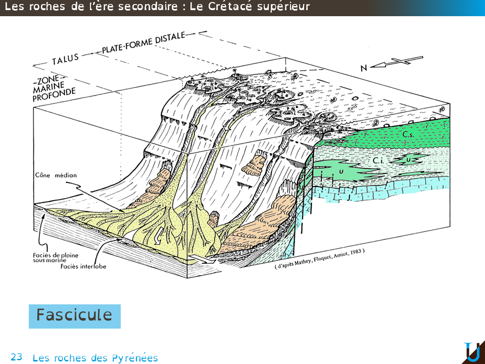 Voici une représentation du sillon Nord pyrénéen. Sur les marges de ce sillon se poursuit le développement de la plateforme carbonatée. Les dépôts gravitaires présents sur la pente sous forme d'écoulements en masse et sur le glacis sont forme de systèmes turbiditiques avec des chenaux et des lobes sont tout à fait comparables aux dépôts gravitaires profonds actuels. Cette représentation est intéressante car elle illustre en coupe, sur le côté les déformations subies par les formations calcaires jurassiques et crétacées au cours de l'ouverture de ce sillon. Cette ouverture a entraîné l'effondrement de la plateforme carbonatée par le biais d'un ensemble de failles normales.