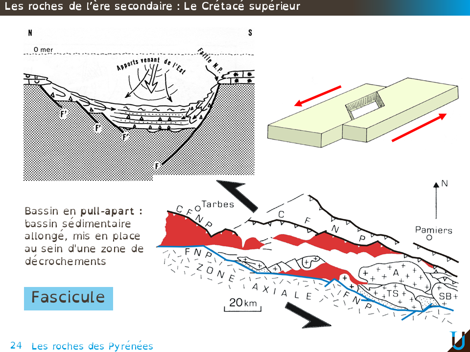 La carte actuelle du sillon Nord Pyrénéen mis en évidence en rouge sur cette carte par les bassins sédimentaires de flysch présente un ensemble de bassins losangiques de type bassins en pull-apart. Un bassin sédimentaire pull-apart est un bassin sédimentaire allongé, mis en place au sein d'une zone de décrochements. Ici le décrochement est lié au fonctionnement coulissant senestre de la faille Nord-Pyrénéenne.