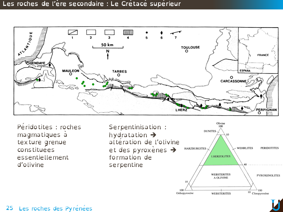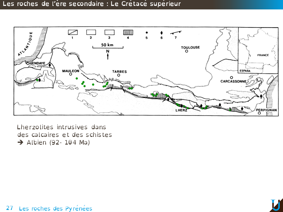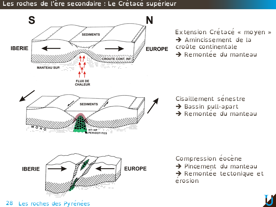Au cours du Crétacé, nous avons vu qu'il y a eu un début de rifting continental. Ce début de rifting a entraîné un amincissement de la croûte continentale et donc une remontée du Manteau. Cette remontée du Manteau s'est traduite par la mise en place de massifs de péridotites. Ces péridotites se sont mises en place au moment de la formation des bassins en pull-appart liés au cisaillement senestre le long de la faille Nord Pyrénéenne. Ces péridotites sont donc intrusives au sein de roches sédimentaires. Autour des massifs de péridotites on retrouve des roches métamorphiques de type marbre et micaschiste, il s'agit ici d'un métamorphisme de contact, donc HT et BP liés à l'intrusion des péridotites.