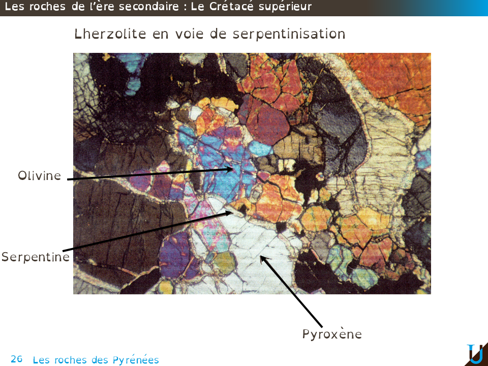 Voici une photo de lame mince en lumière polarisée-analysée d'une péridotite, ici de la lherzolite en voie de serpentinisation. Ici, les pyroxènes (en gris clair ou gris plus foncés) ainsi que les olivines (dans les teintes plus vives) présentent à la périphérie une bordure beige correspondant en fait à de la serpentine. La transformation minéralogique Pyroxène / Olivine ⇒ Serpentine s'opère de l'extérieur vers l'intérieur des minéraux.