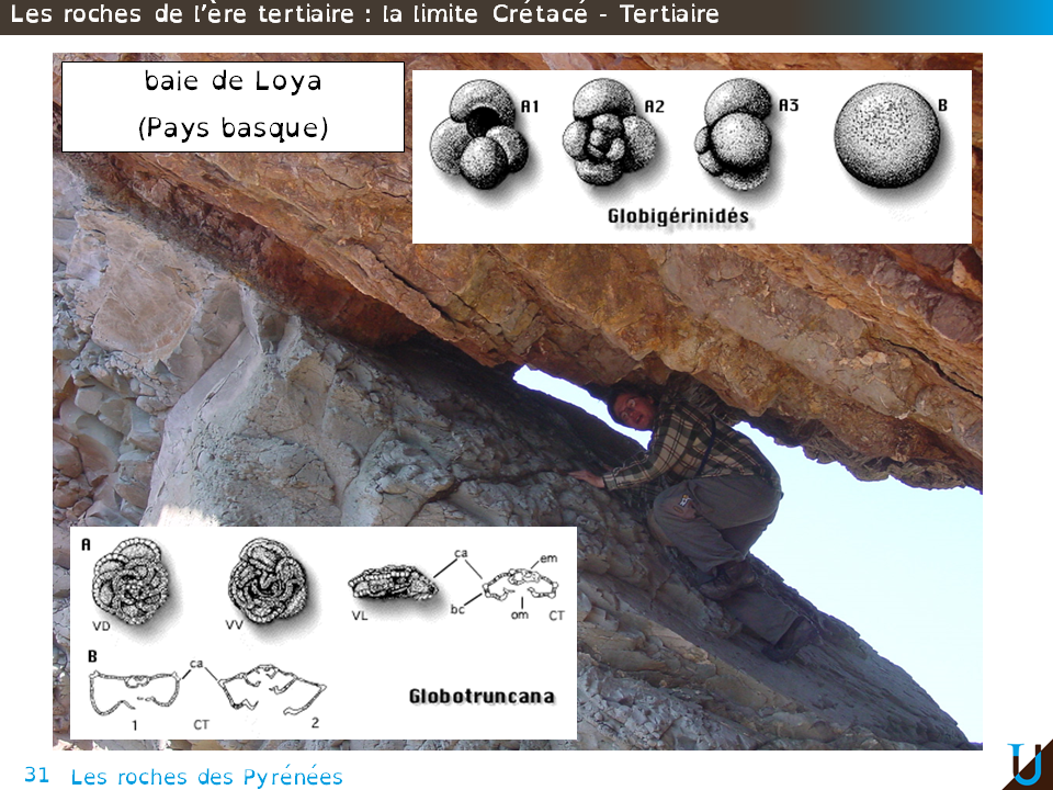 La limite KT, donc Ère secondaire - Ère tertiaire, peut s'observer à différents endroits au sein des Pyrénées. Voici par exemple la limite KT dans le Pays basque, sur la baie de Loya. Cette limite est caractérisée par une crise biologique majeure, avec entre autres la disparition des ammonites, des dinosaures, des rudistes. On la repère généralement par le passage entre les foraminifères planctoniques du Genre Truncana caractéristiques du Crétacé, et les Globigérinides caractéristiques du Tertiaire.