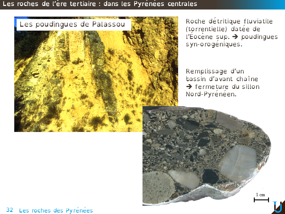Le poudingue de Palassou correspond à une roche détritique fluviatile, plutôt torrentielle datée de l’Éocène supérieur. On retrouve cette formation juste au Nord du chevauchement frontal Nord Pyrénéen. La sédimentation de ces poudingues a été contemporaine du chevauchement frontal, on parle de poudingues syn-orogéniques. C'est la datation des poudingues qui à permis de connaître l'âge du chevauchement. Ces poudingues se mettent en place au cours de l'émersion Éocène supérieur liée à l’orogenèse, avec le remplissage d'un bassin sédimentaire d'avant chaîne et le comblement du sillon Nord Pyrénéen.