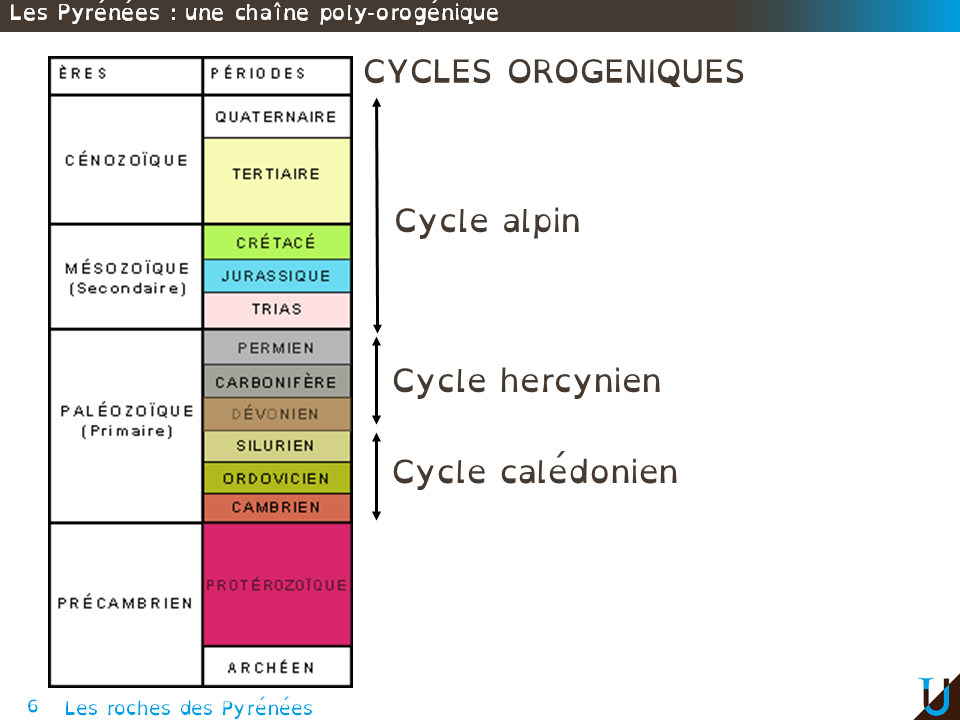 Les Pyrénées sont une chaîne poly-orogénique, c’est à dire une ayant subi plusieurs orogenèses différentes. Malgré ceci, le dispositif structural et morphologique actuel est d’âge alpin, c’est à dire essentiellement lié à la dernière orogenèse. Les déformations importantes liées à l’orogenèse alpine, dernière en date rend difficile l’étude des orogenèses antérieures. L’orogenèse alpine au sens large englobe l’ensemble du Mésozoïque et du Cénozoïque. Des témoins d’orogenèses antérieurs existent, avec essentiellement des témoins des orogenèses calédonienne et hercynienne. Des témoins d’orogenèses encore plus anciennes c’est à dire précambriennes existent également. Nous nous attarderons uniquement sur l’orogenèse la plus récente, celle liée au cycle alpin.
