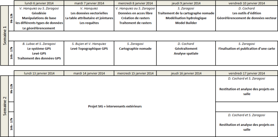 9h-12h S. Zaragosi - Géodésie & Manipulations de base 14h-17h B. Lubac & S. Zaragosi - Le système GPS - Levé GPS sur le campus == Mardi 7 janvier 2014 == 9h-12h V. Hanquiez - Les données vectorielles - les requêtes 14h-17h S. Bujan & V. Hanquiez - Levé topographique par GPS