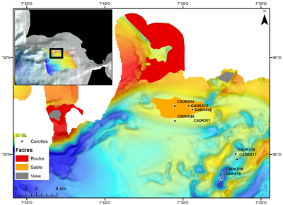 - A partir des couches “Carottes”, “Facies”, “mnt”, “Etopo2” (Séance1), et “Country” (Séance1), réalisez une mise en page avec un carroyage, une légende, une échelle et l'emprise de la carte sur une du golfe de Cadix.