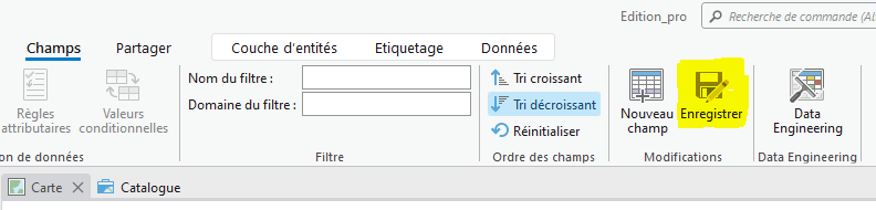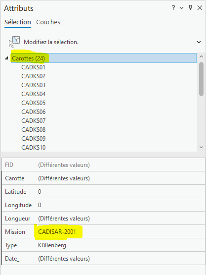- Dans la boite à outils Attributs modifiez le nom de la mission CADISAR par CADISAR-2001 pour toutes les carottes, mais de façon automatique.