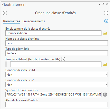- Ouvrez un onglet Catalogue et dans votre répertoire de travail créez un nouveau fichier de formes (shapes) de type surface (polygones). Dans le catalogue, clic droit dans le répertoire - nouveau - fichier de forme ou Géotraitement - Créer une classe d'entité (create feature class). Nommez-le “Facies”. Renseignez la géodésie suivante : WGS 1984 UTM Zone 29 N - EPSG 32629.