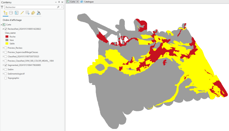 A la fin du traitement le classificateur d'image va vous créer un raster classifié avec les trois classes : Roche, Vase et Sable.