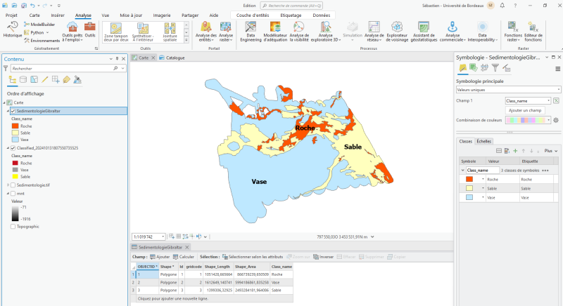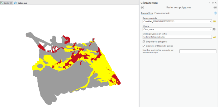 La fonction “raster vers polygones” permet de convertir une zone d'un raster composée de pixels contigus ayant les mêmes valeurs en un polygone. Lorsqu’on applique cet outil au raster “sédimentologie”, un fichier de type shapefile est créé, mais il contient 33 catégories distinctes de polygones. Ce nombre élevé s'explique par l'hétérogénéité des couleurs des pixels. Il est donc nécessaire de simplifier le raster en attribuant les valeurs des pixels aux trois catégories sédimentaires. La classification automatique permet de réaliser cette opération.