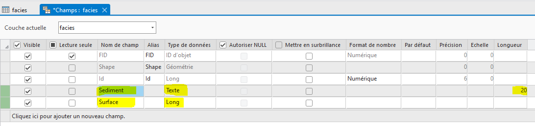 Enregistrez les modification effectuées dans la table attributaire en fermant la fenêtre “champs : facies” ou en enregistrant les modifications dans la fenêtre champs.