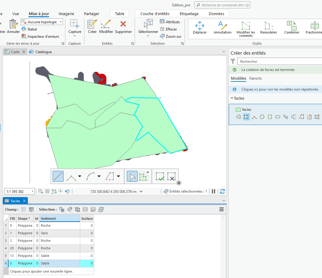 - Pour créer des entités sur un shapefile, ouvrez la fenêtre “Mise à jour” et cliquez sur l'icône “Créer”. Dans la fenêtre “Créer des entités” qui apparaît, sélectionnez le modèle “facies” et utilisez l'outil “Polygone” pour numériser.