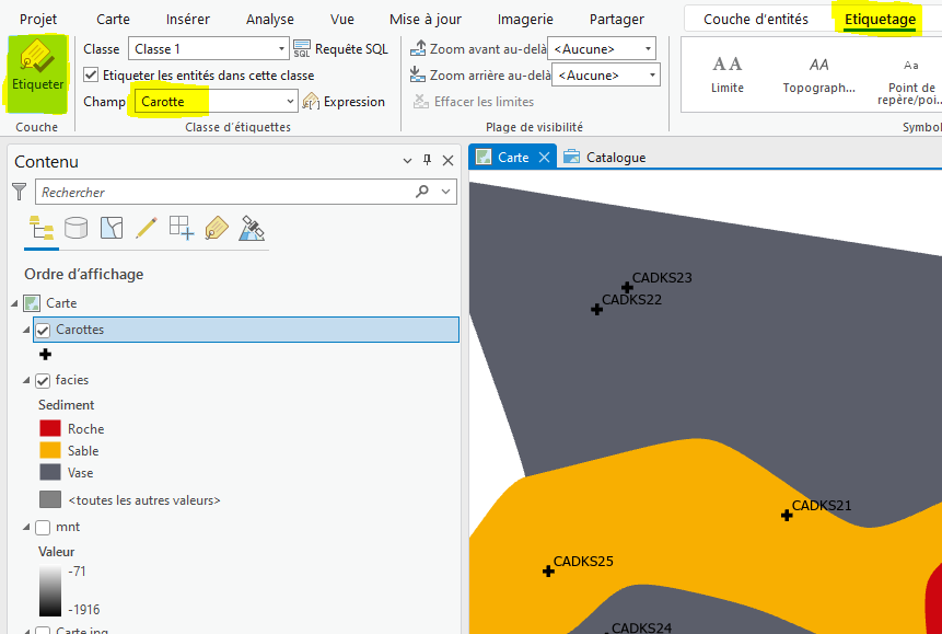 - Chargez le fichier de points “carottes.shp”, il contient les sites des carottes sédimentaires réalisées sur la zone.